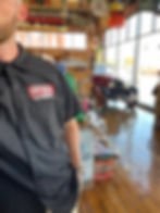 Black "Red Kap" brand workshirt emblazened with the Fat Boys Speed Shop logo featuring Lady Luck and cross flags on the back and logo on the left chest. Shirt is 65 poly/35 cotton for durability.
